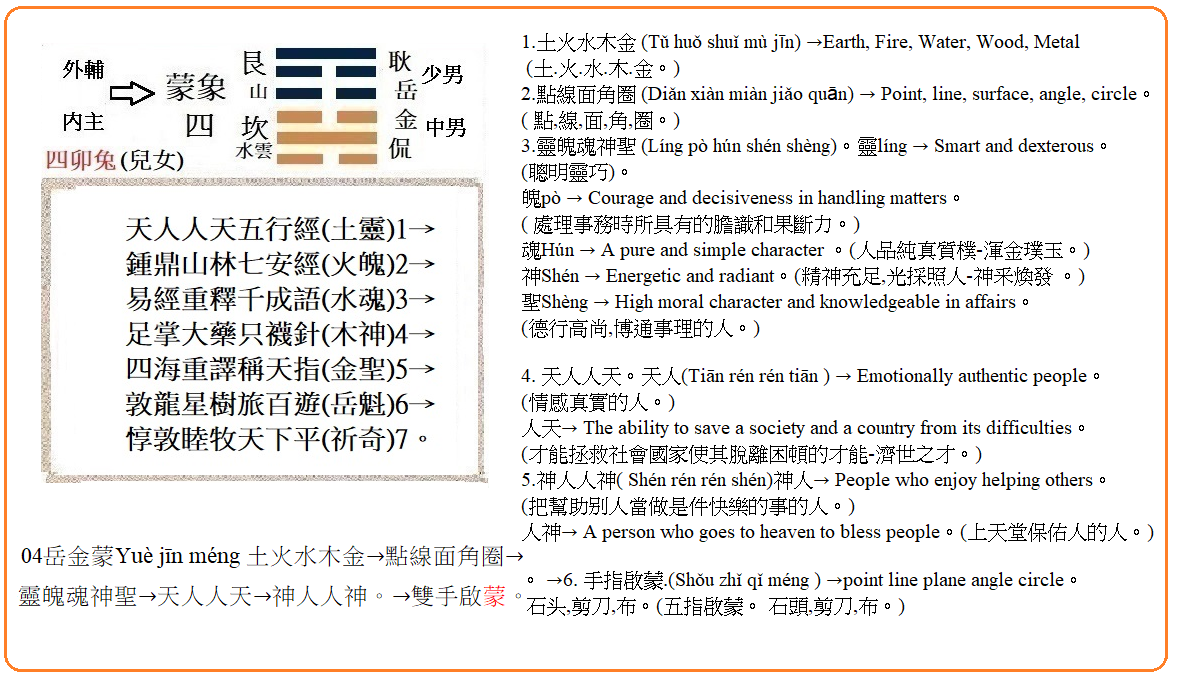 04岳金蒙Yuè jīn méng: 土火水木金→點線面角圈→靈魄魂神聖→天人人天→神人人神。→雙手啟蒙。(艮岳-坎金)。
