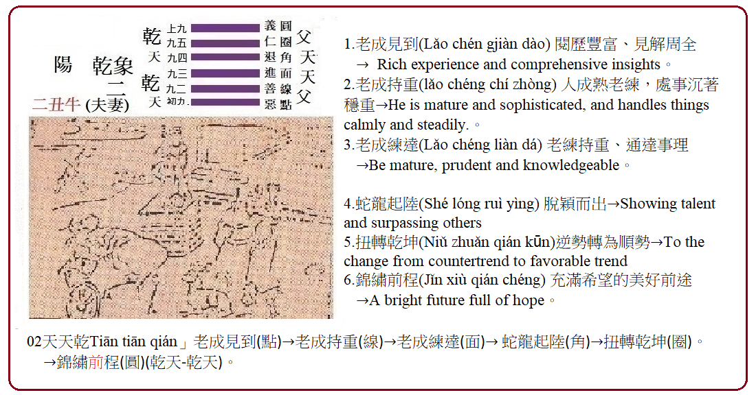 * * 易義九二爻:包蒙吉;納婦吉;子克家。 →「包蒙吉」包恥忍恥、負任蒙勞、急公好義;「納婦吉」納諫如流、夫唱婦隨、急人之困;「子克家」子孝父慈、克勤克儉、白手起家。【●象徵寬容與包容,善用德行與責任解決問題。→修身■做事包容忍讓,尊重他人意見。→智慧◎德行與責任是家庭與事業穩健的基礎。】
