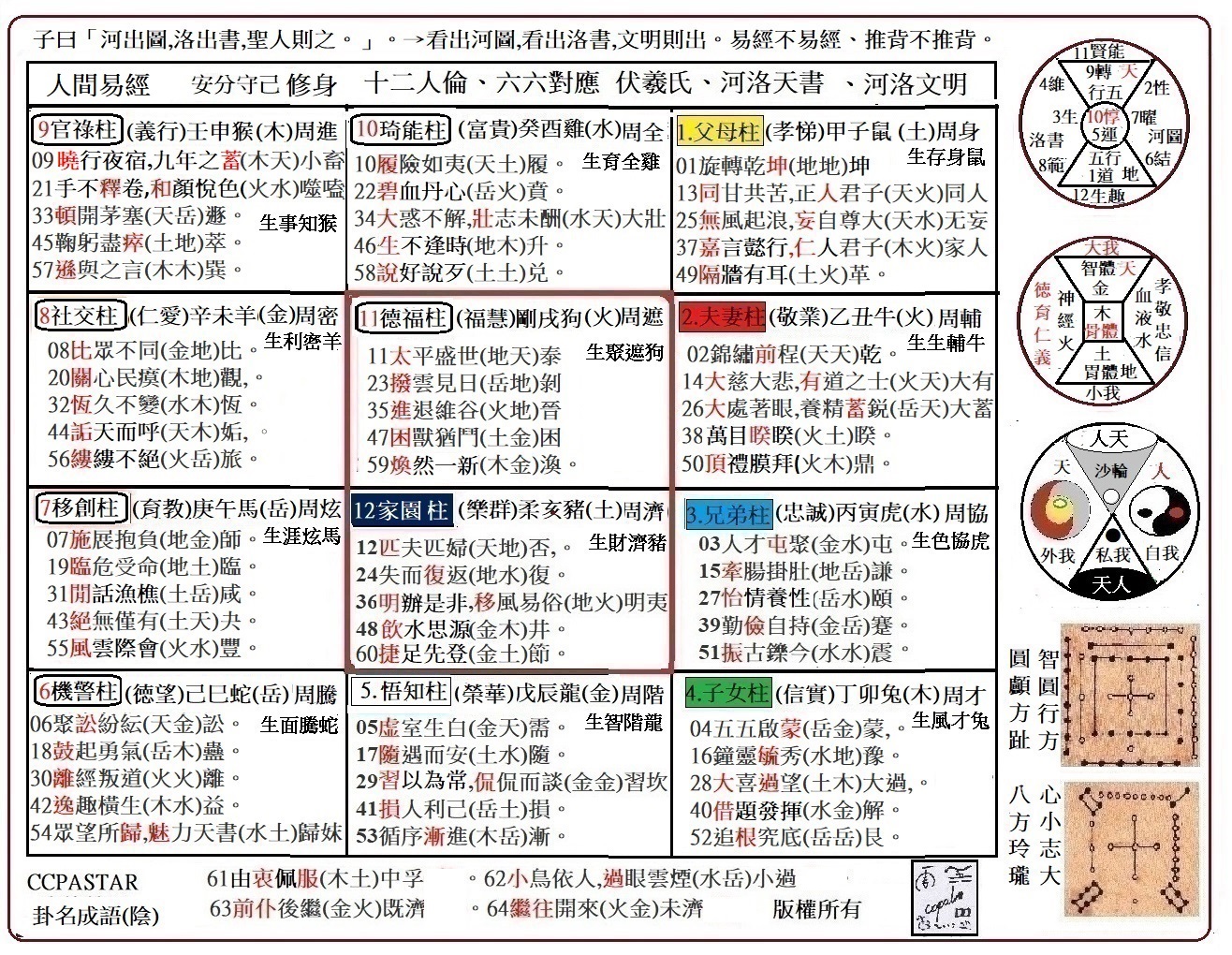 6.Social Pathways(社會進程)蛇岳: 啟(點)→群(線)→法(面)→協(角)→教(圈)→禮(圓)。→統(宇)。原始至文明。文明路(敦睦)艮卦根。