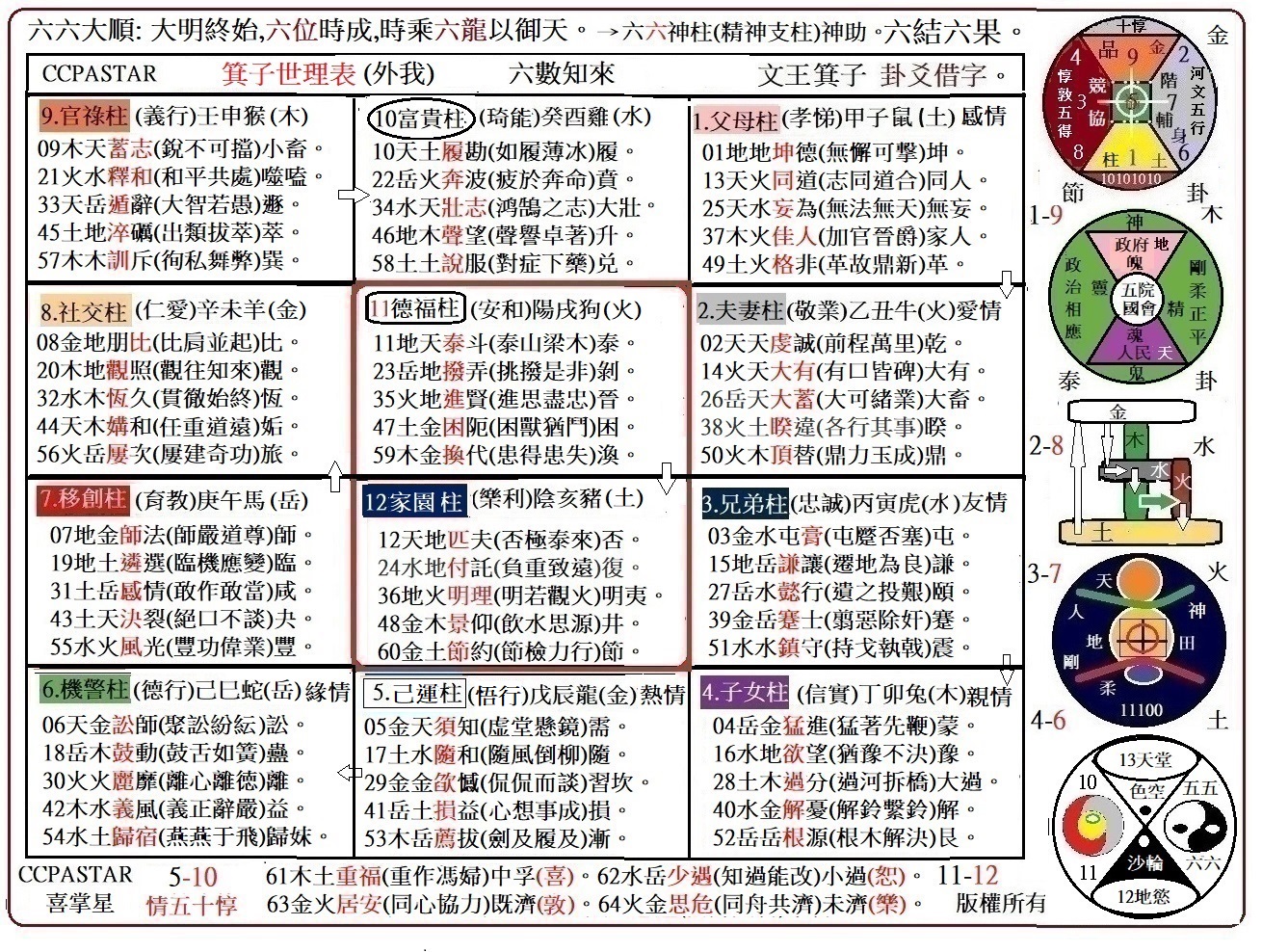 5.Body Matrix(人體系統)龍金: 養體(靈)1土→神經(魄)2火→循環(魂)3水→骨體(神)4木→智體(聖)5金→身段(魁)6岳→名聲(承)7宙。康壽路(喜掌)。 坎卦侃。