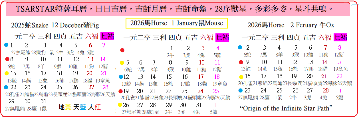 TSARSTAR特薩耳曆,日日吉曆,吉師月曆,吉師命盤,28序獸星,多彩多姿,星斗共鳴。